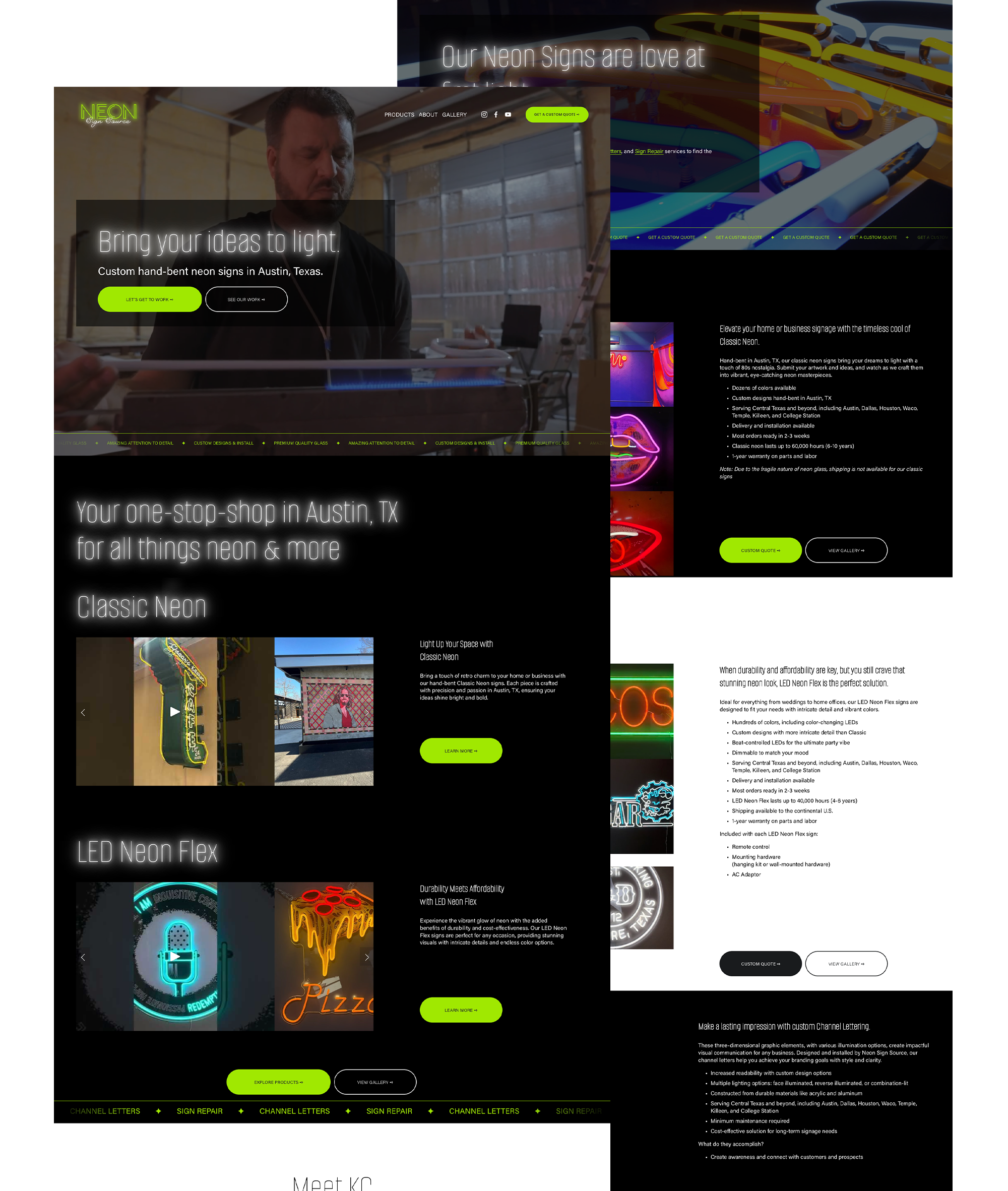 We executed the plan by building a new website on Squarespace, giving KC a straightforward, user-friendly tool to manage and showcase his work in real time. To complement the website, we produced high-quality visuals and videos that not only display his neon artistry but also convey his passion and skill to potential clients. This holistic approach ensured his digital presence was as vibrant as his creations.